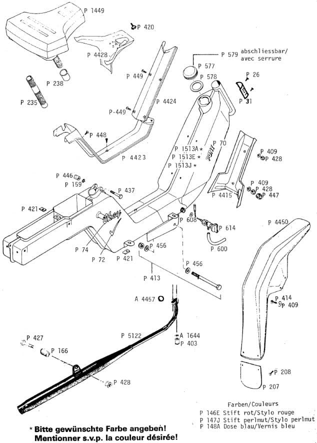 Auspuff - Rahmen - Sattel - Benzinhahn - Schutzblech v.