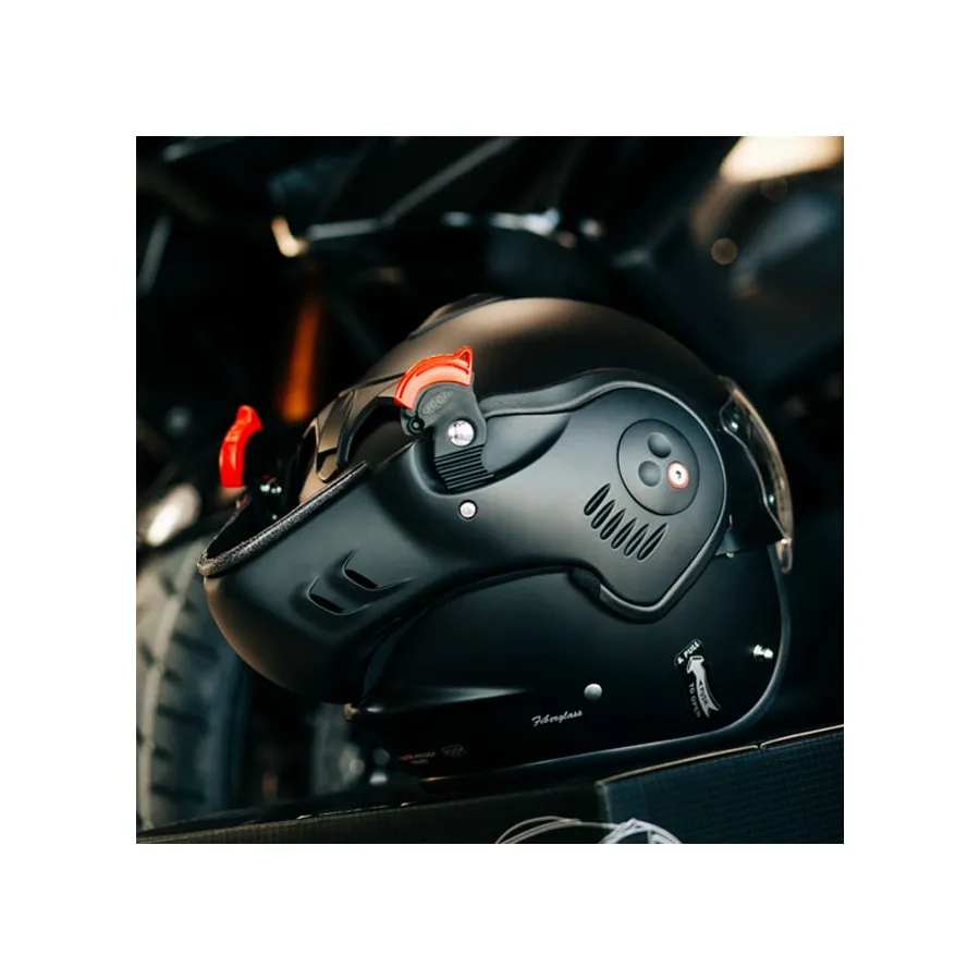 Der Roof Boxer V8 Alpha erfüllt höchste Sicherheitsstandards und ist nach ECE 22.06 zertifiziert. Das robuste Material der Helmschale besteht aus einer widerstandsfähigen Glasfaserverbindung, die besonders stabil und dennoch leicht ist. Zusätzlich sorgt die doppelte Homologation als Jet- und Integralhelm für maximale Sicherheit in beiden Tragevarianten. Der Ratschenverschluss des Helms gewährleistet zudem eine einfache Handhabung und sicheren Sitz während jeder Fahrt.