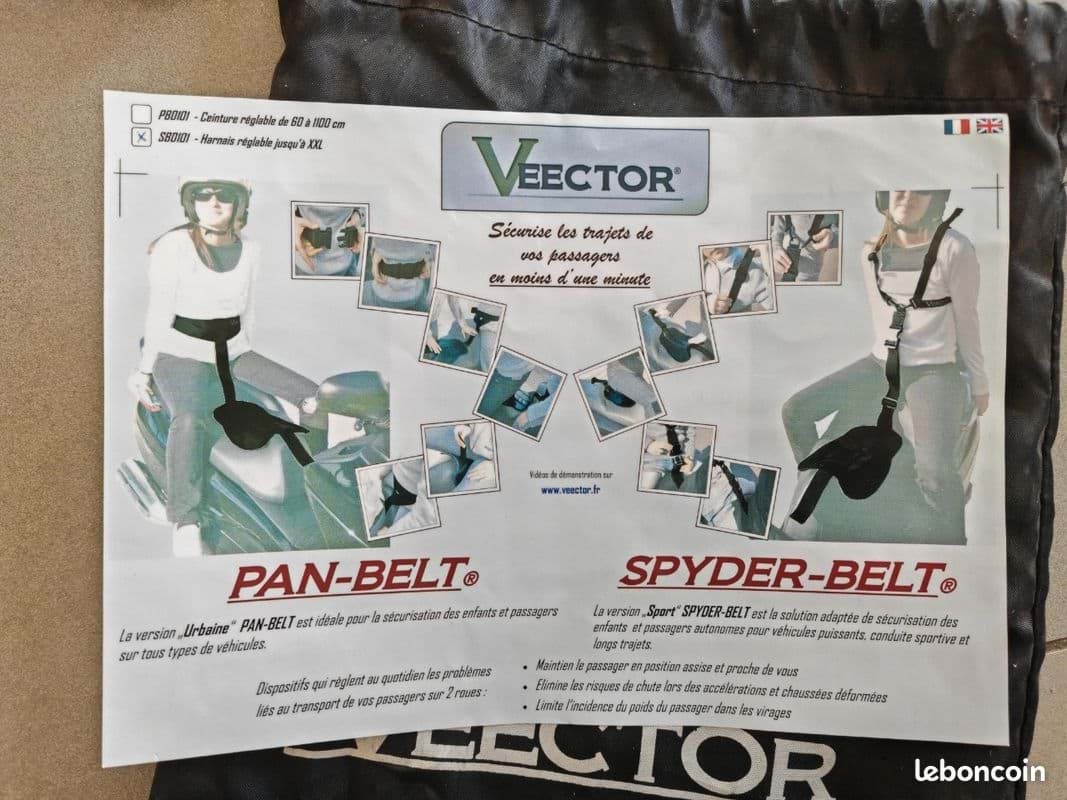 Beim Spyder-Belt wird der Beifahrer von einem mehrfach verstellbaren Geschirr gehalten. Der Passagier sitzt so auch bei sportlicher Fahrweise, langen Fahrten und Fahrzeugen mit grossem Hubraum sicher, da das Geschirr den Körper optimal hält und so insbesondere Erwachsenen einen hohen Tragekomfort bietet. Das System muss nicht am Fahrzeug befestigt werden und ist in weniger als einer Minute angelegt. Aufgrund der geringen Abmessungen kann es unter dem Sitz oder in einer Tasche verstaut werden.